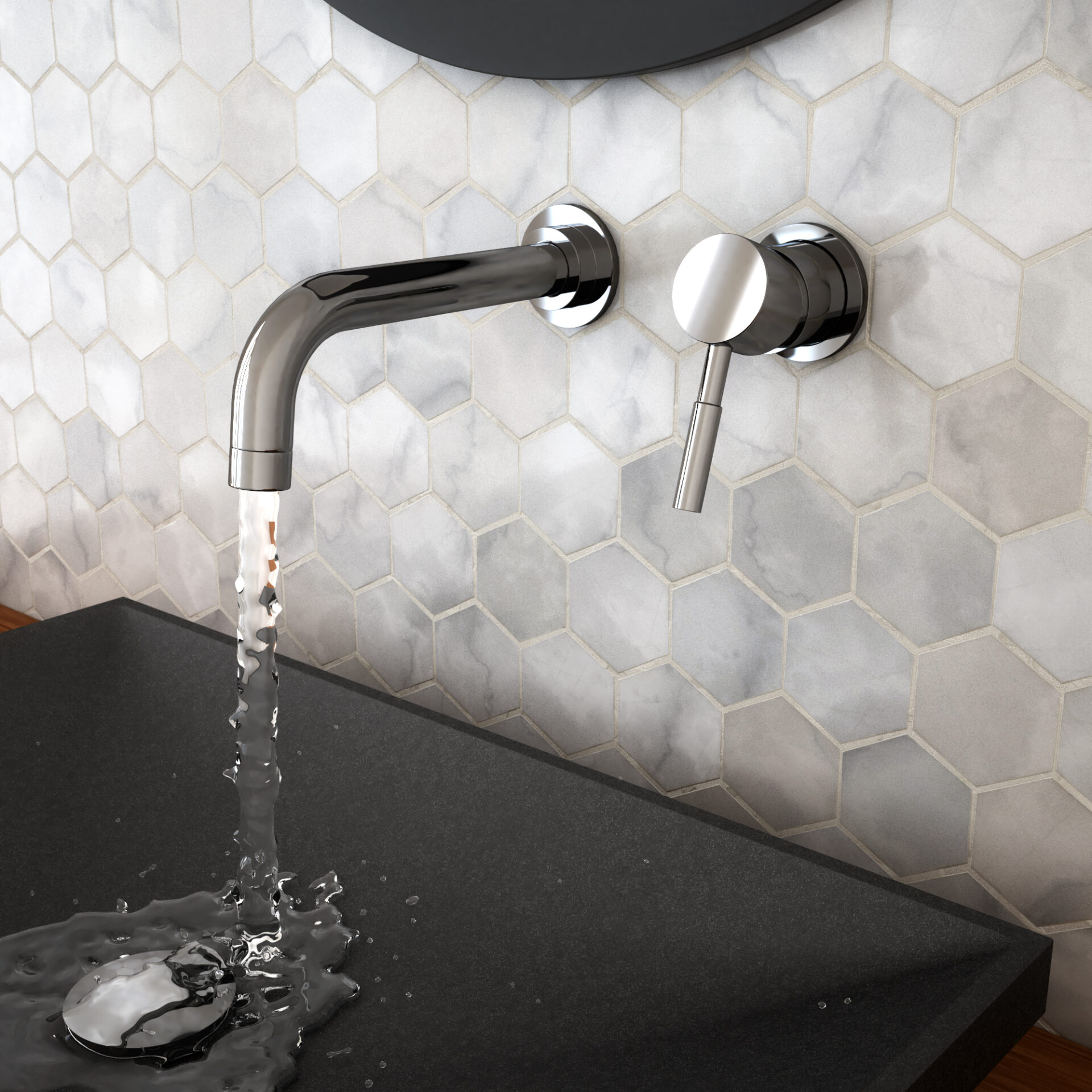 A unique double-hole, wall-mounted faucet with a recurring circular motif. The elongated spout will hang majestically over a vessel bathroom sink and the separate handle system ensures clutter-free shelf space.